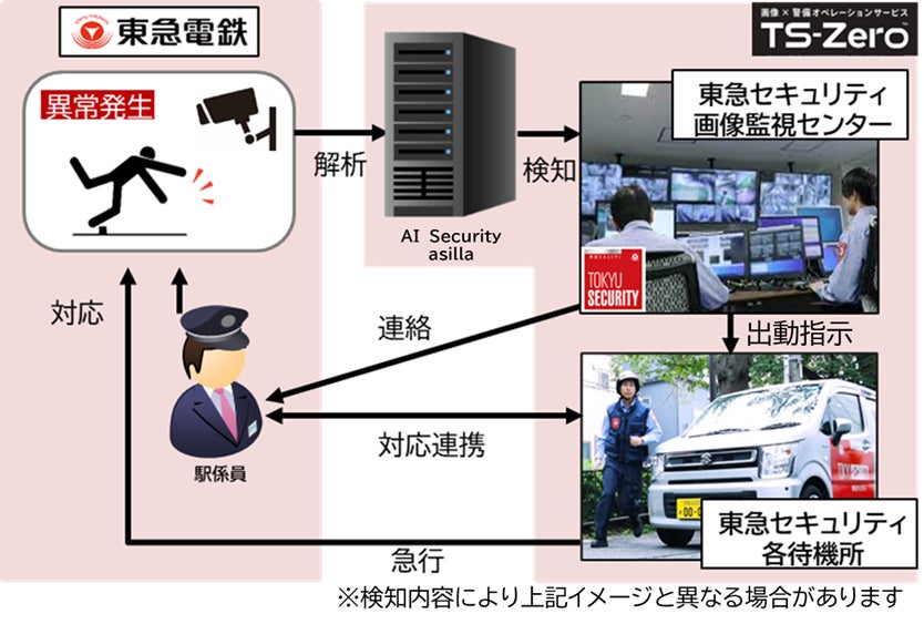 「TS-Zero®」では、アジラのAI警備システム『AI Security asilla(以下、『asilla』)※2』によって駅構内で発生したお客様トラブルや転倒・長時間の滞留を検出した映像を、東急セキュリティ画像監視センターで監視員が確認を行い、必要に応じて駅係員と警備員が連携して速やかに対応することで安全性とお客様サービスの向上を目指します。