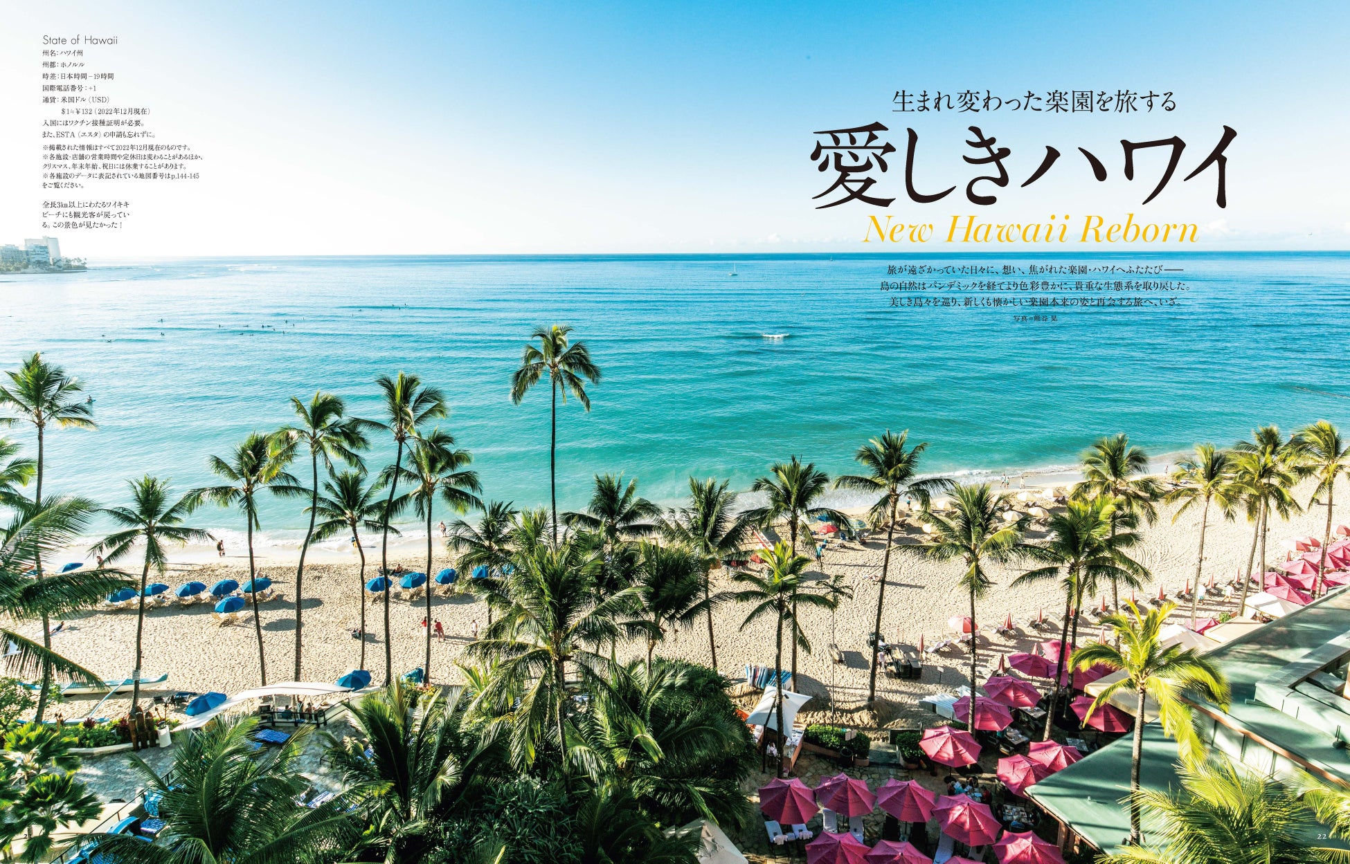 パンデミックを経て、大リゾートアイランド・ハワイ諸島はどう変わったのか? 今の姿を探るべく、ハワイ島、マウイ島、ラナイ島、カウアイ島、そしてオアフ島の5島を3チームのスタッフが延べ1カ月をかけて取材しました。日本のメディアとしてはパンデミック後の先駆けとなる大ボリュームのハワイ特集です。