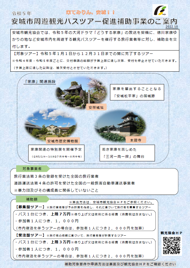 安城市観光協会では、令和5年1月から放送される大河ドラマ「どうする家康」を契機とした観光客の誘致を図るため、徳川家康ゆかりの地を含めた安城市内を周遊する観光バスツアーを催行する旅行業者等に対し、補助金を交付します。