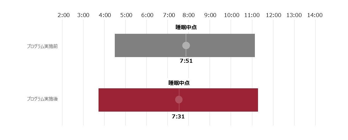 平均入眠時間が48分前倒し、平均起床時間が8分後ろ倒しとなり、睡眠時間は平均56分延長し、睡眠リズムの指標である睡眠中点(睡眠時間の真ん中の時間)が平均で15分前倒しとなりました。これは睡眠に関する意識変容による変化であると考えられます。