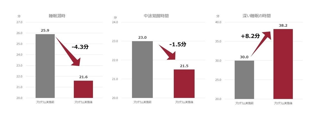 平均睡眠潜時は4.3分短縮となり、本プログラムに参加した6名中5名で改善傾向、中途覚醒時間に関しては1.5分の短縮に留まり変化は限定的となりました。しかし、深い睡眠の時間は8.2分増加しており、より質の高い睡眠が取れるようになった可能性が考えられます。