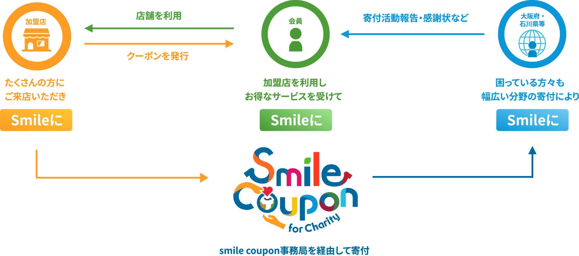 「Smile Coupon」は、大阪府内の飲食店で使用できるデジタルクーポンです。クーポン利用料金の一部が、ユーザーの選択に応じて「大阪府子ども輝く未来基金」または「石川県能登半島地震義援金」に寄付されます。