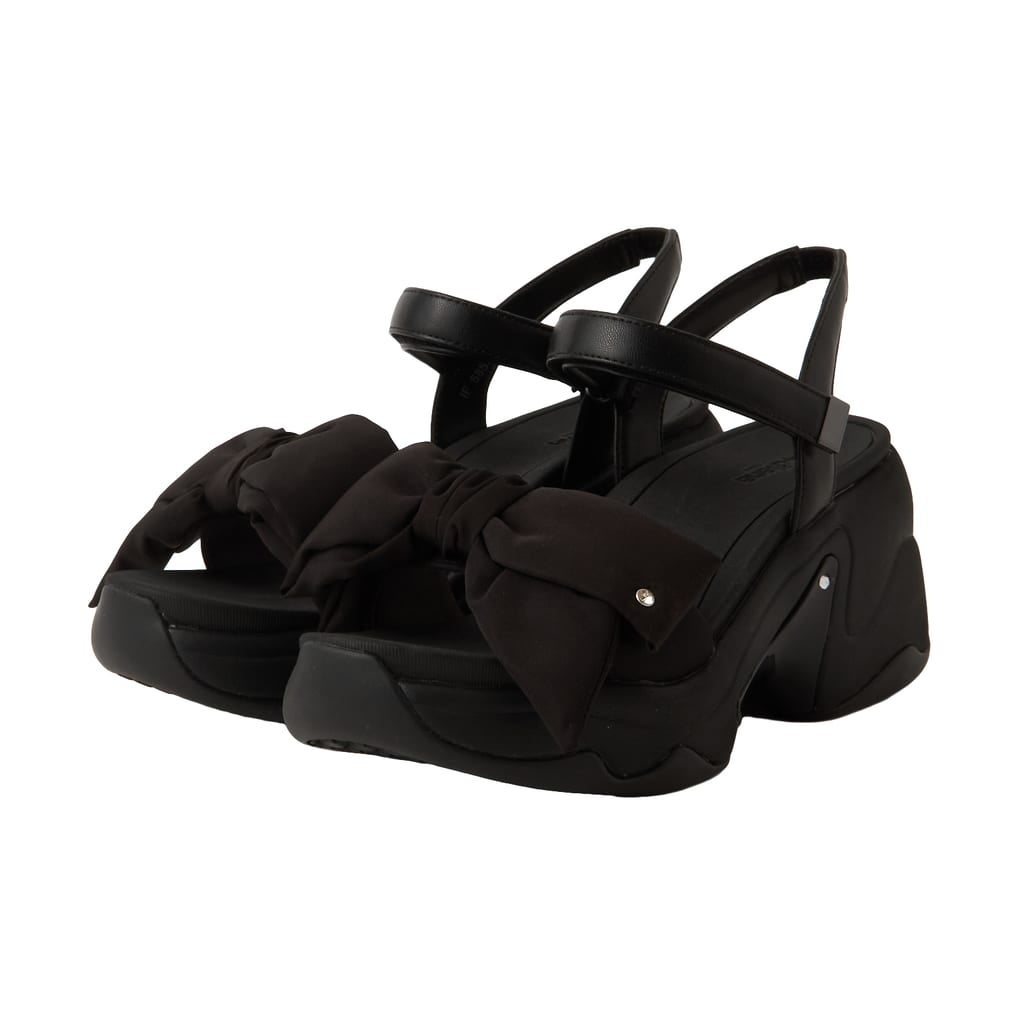 ボリュームソールに、大ぶりリボンと華奢な足首ベルトを組み合わせたヒールアップスポサン。メリハリのあるバランス感で、脚を華奢に見せてくれます。