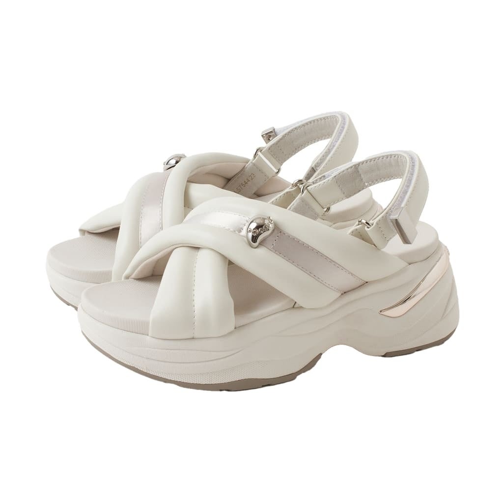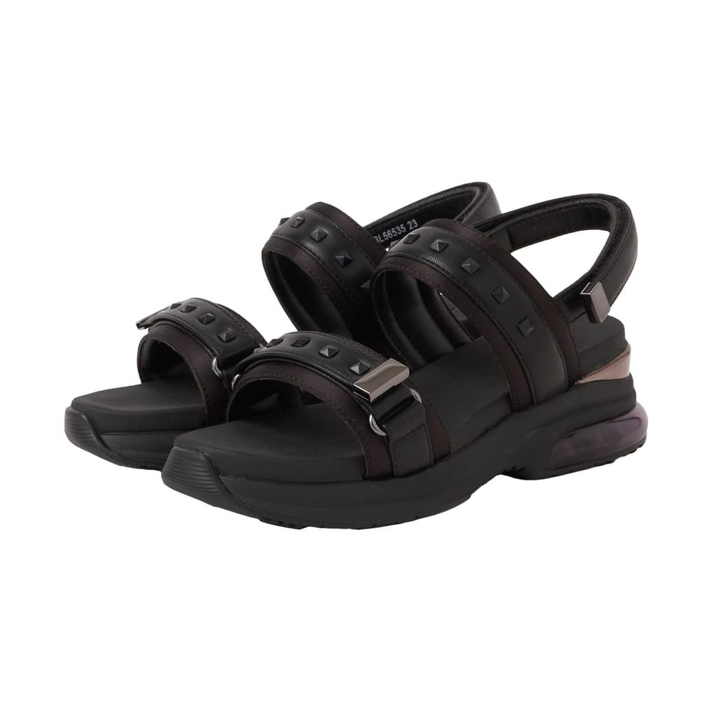 透け感のあるエアクッションソールが軽やかな印象のスポサン。サテンに人工皮革スムースを重ねた立体感のあるベルトに、ピラミッドスタッズでさりげなくエッジをプラス。フットベッドはふかふかで、足を乗せた瞬間から心地よく、踵はマジックテープ仕様で着脱もスムーズ。ボリュームを抑えたバランスで、スタイリングを選ばず取り入れやすい一足です。