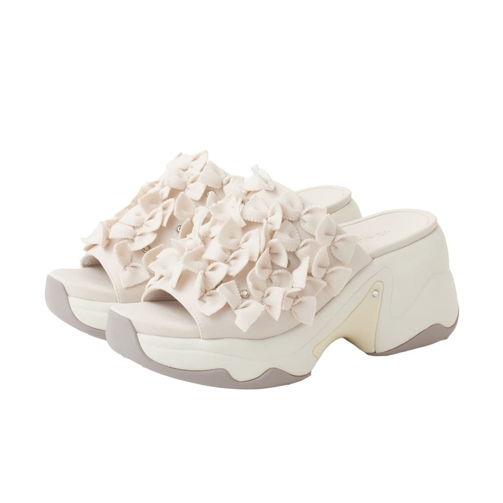 たっぷりのプチリボンとビジューを散りばめたヒールアップミュールスポサン。抜け感のあるニットリボンがフェミニンでありつつどこかモードな雰囲気で、足元が新鮮に映る一足です。