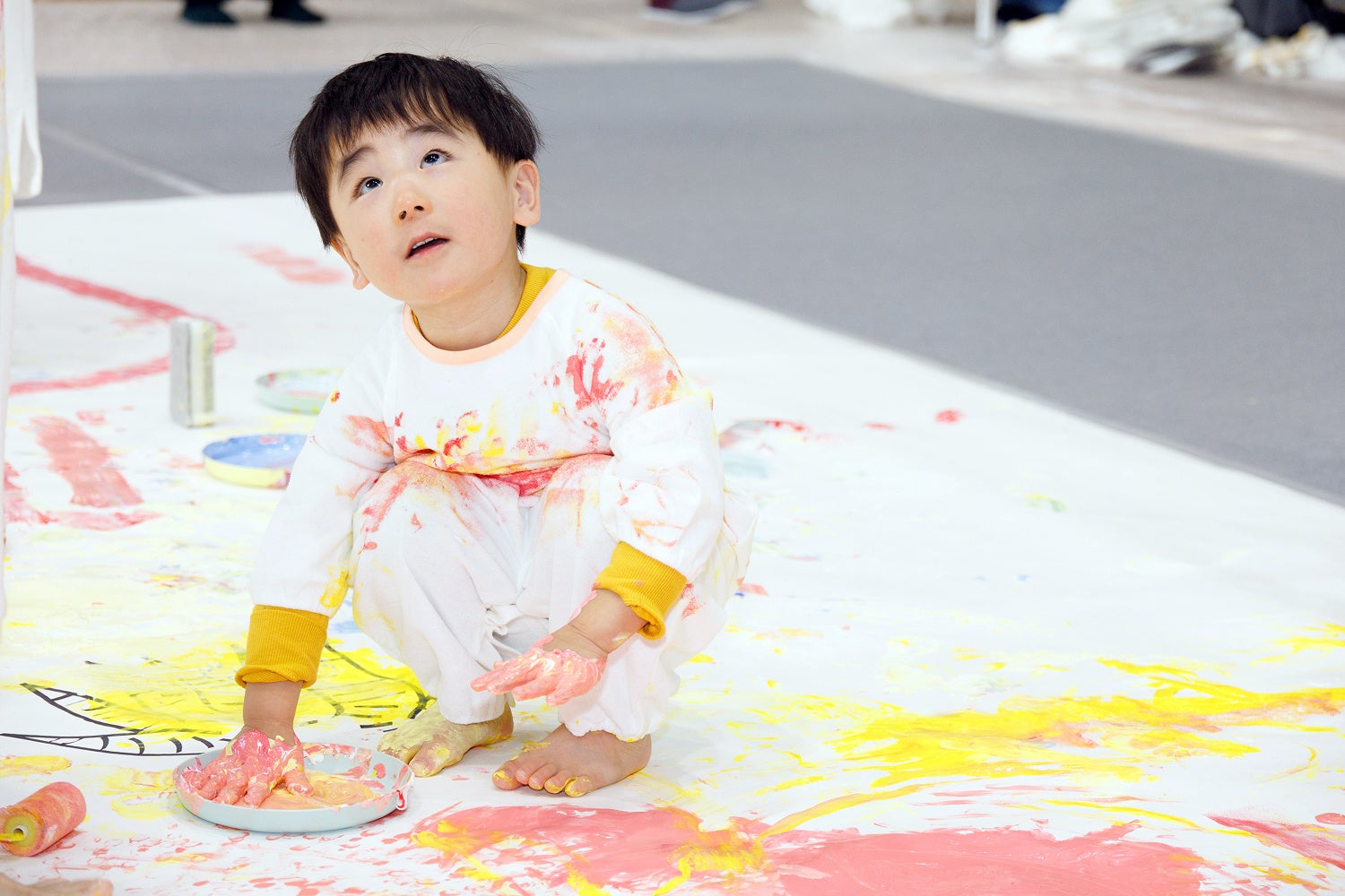 家では子どもを見守ったり、携帯で子どもの写真を撮る側になってしまうので、親子一緒に夢中になって、えのぐ遊びができて楽しかったです。おえかきウェアだと子どもの服が汚れる心配がないし、「逆に汚してもいいんだ」という感覚が面白かった!洗濯してまた使えるのもいいですね。子どもがきれい好きで、普段手が汚れるのを嫌がるタイプだけれど、今日は自分から足にえのぐを塗るなど、開放的な様子が見られて驚きました。