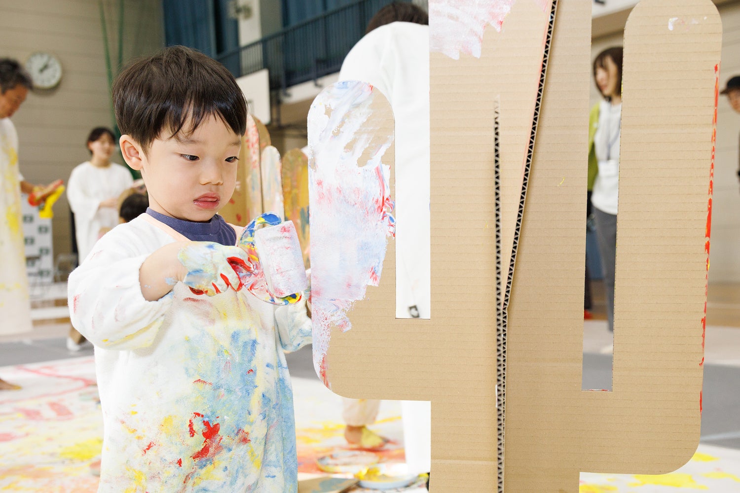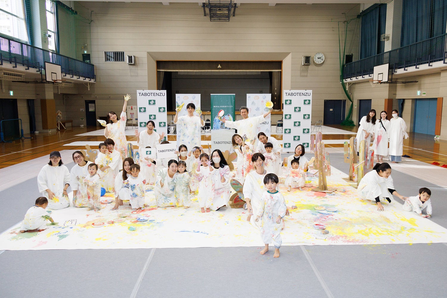 当日は、事前抽選で選ばれた12組(25名)の親子が参加しました。イベントの始めには、TABOTENZUブランド責任者が新商品とブランドへの想いを語りました。説明後には、TABOTENZUの新商品「かぞくのおえかきウェア」をご家族に着用いただき、えのぐあそびがスタート。体育館いっぱいに広げられた模造紙や、1mのサボテン型ダンボール、そして子どもとおとながお互いのウェアに「ゆびえのぐ」をつけあいながら、汚れることを気にせず親子で思いきり“えのぐあそび”を楽しむ様子が見られました。えのぐを指で混ぜたり、えのぐの付いた手でハグをしあって、親子で笑い合いながら、ウェアに思い出を残すシーンもございました。