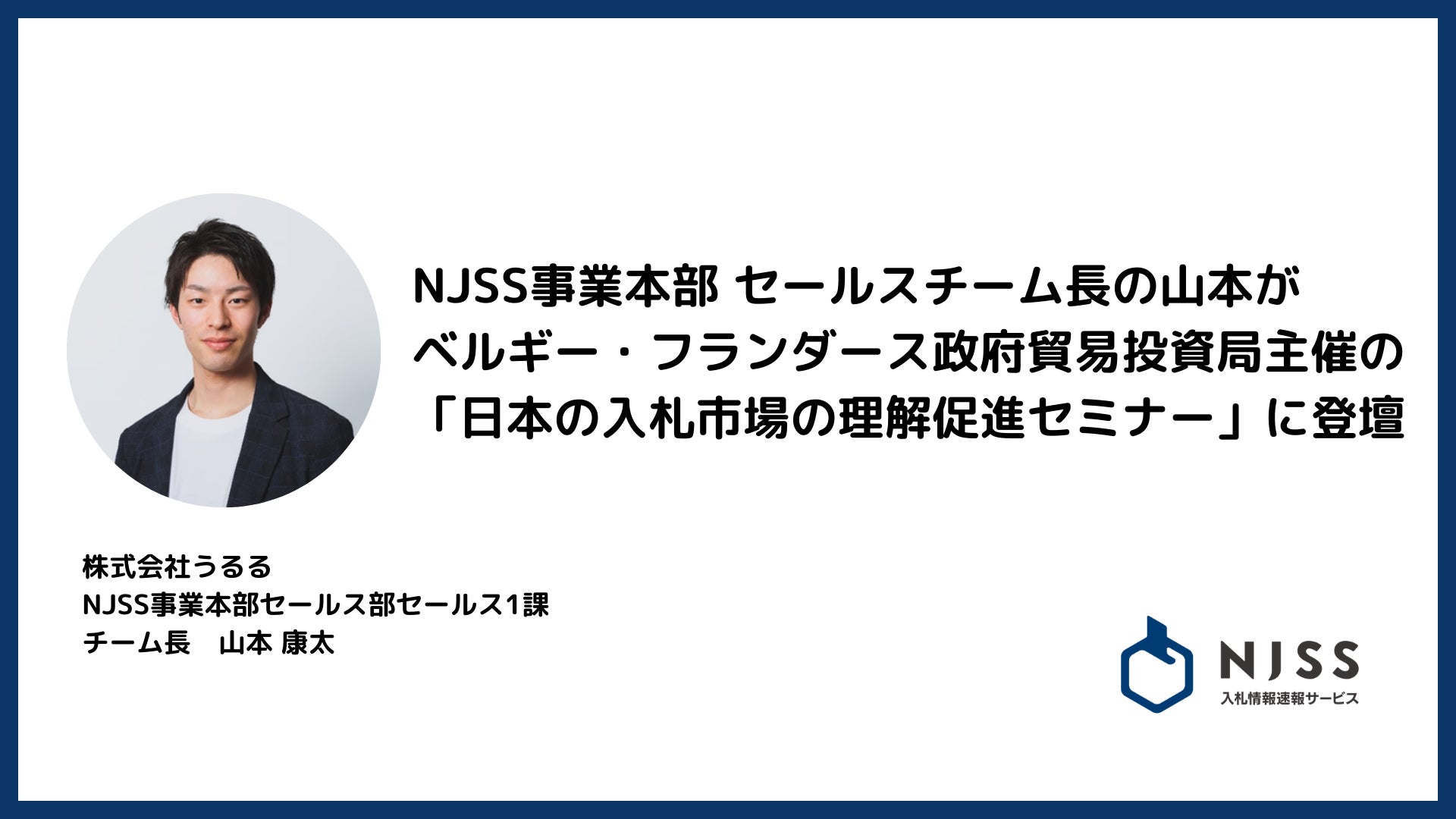 うるるでは、これまでに300社以上への入札支援経験を持ち、現在NJSS事業本部セールス1課でチーム長を務める山本 康太が登壇いたします。日本の入札市場の開拓ヒントを参加企業へお伝えすることを目的に、「データからひも解く入札市場とNJSSについて」と題し、日本の入札市場を取り巻く環境やNJSSが果たす役割について、駐日ベルギー大使館でお話しいたします。