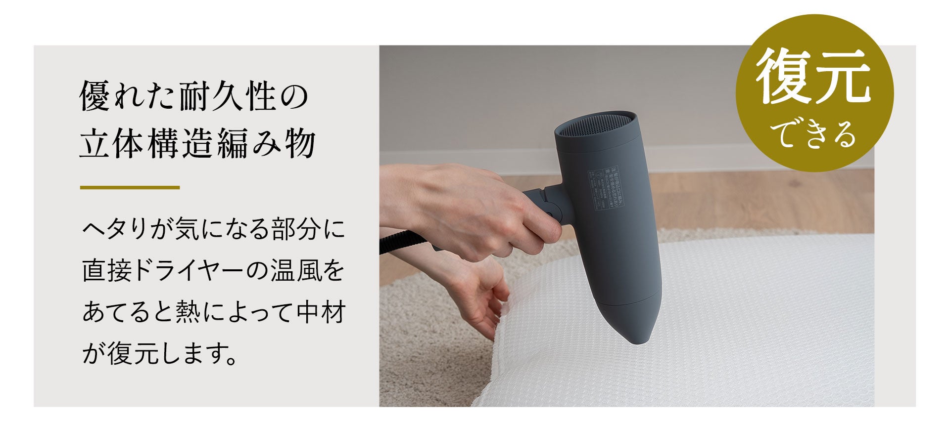 ダブルラッセル構造の中材は、ドライヤーなどで熱を加えることで形状復元します。AirRussマットレストッパーは、家計にも環境にもやさしい寝具です。