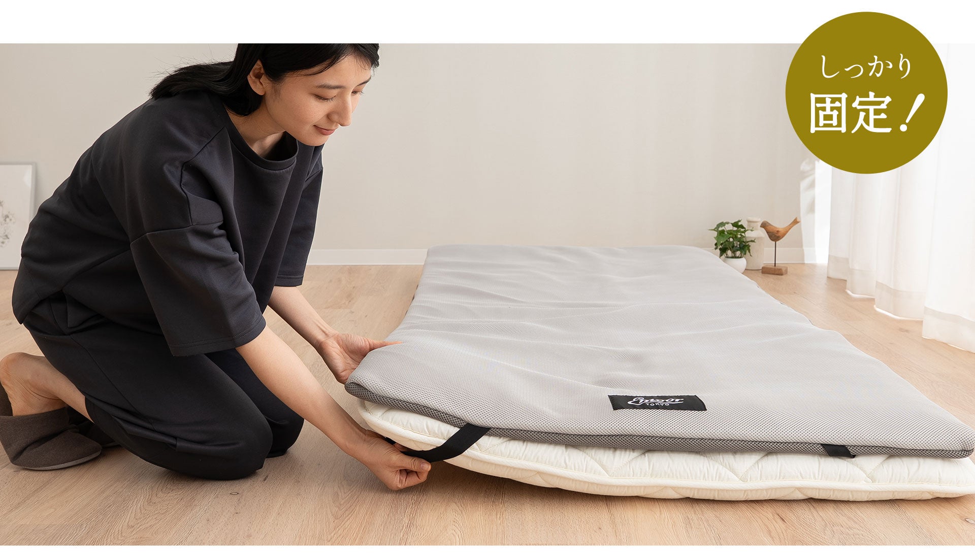 四隅の固定バンドでしっかり固定し、寝ている間もズレにくく快適です。厚さ約4cmのためシーツやカバーもそのまま使用可能。軽量で丸めてコンパクトに収納でき、持ち運びも簡単です。