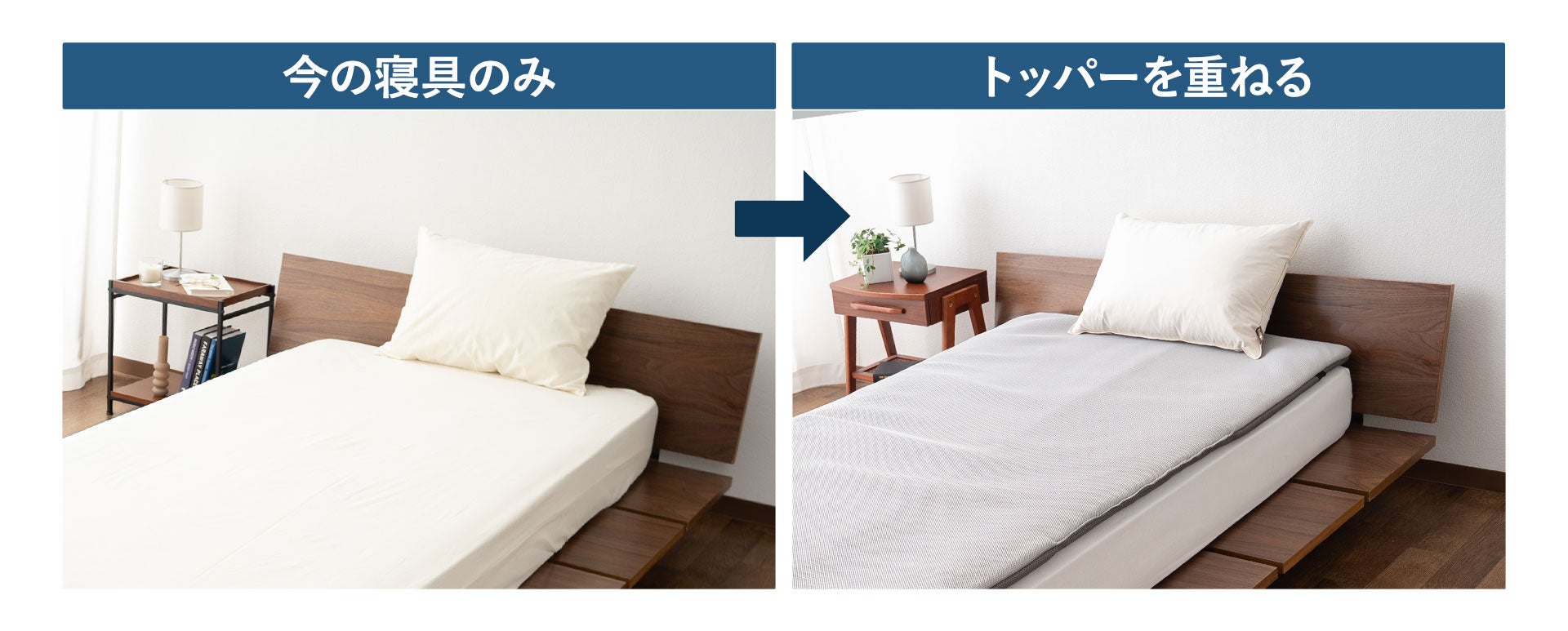 マットレストッパーとは、敷き寝具(マットレスや敷き布団)の上に重ねて使う寝具の一種です。お使いの敷き寝具に足りない要素、例えば寝心地や温湿度コントロールなどを加えることで、手軽に寝心地をアップグレードすることができます。