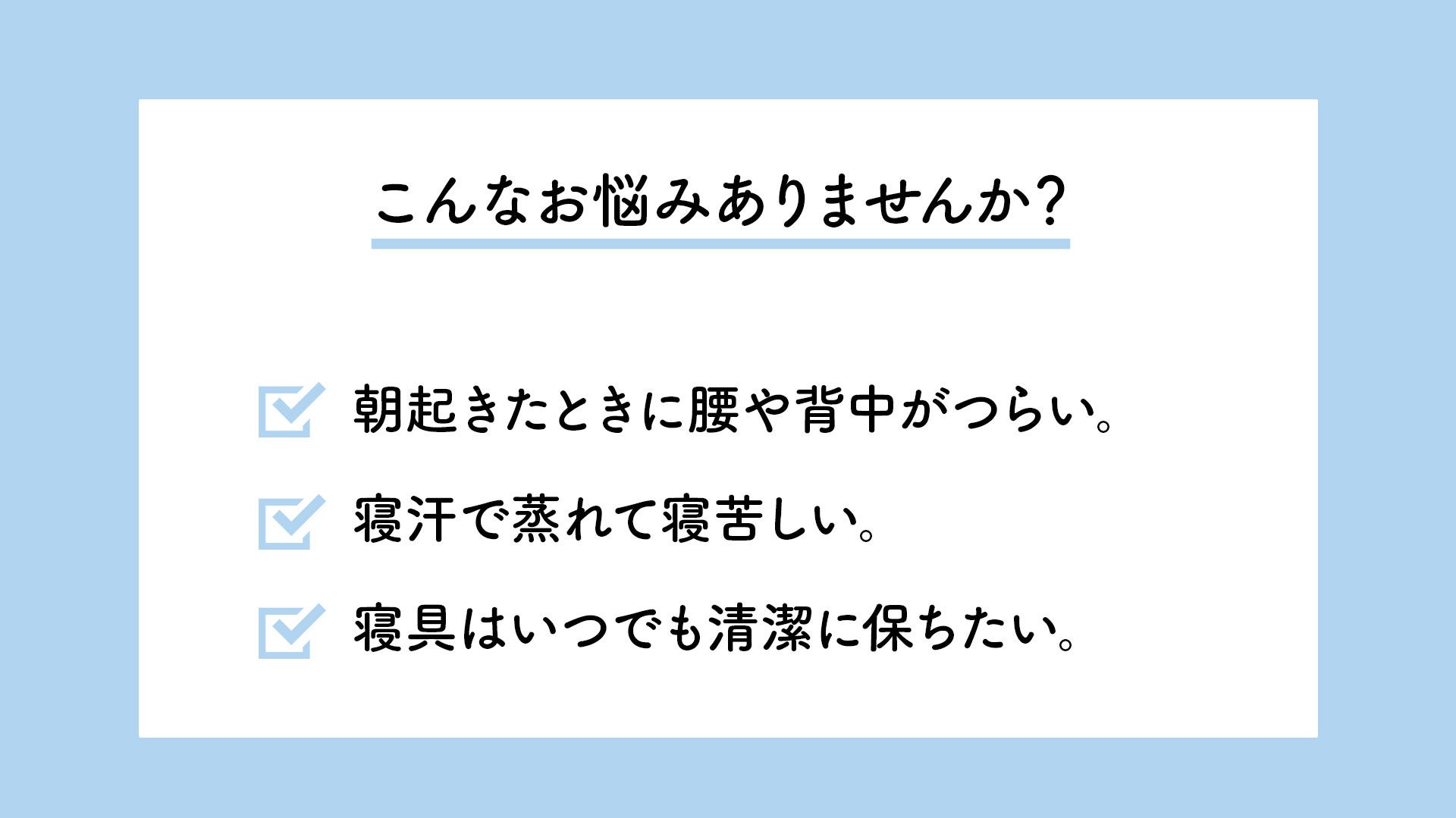 腰や背中に違和感があるものの、マットレスや敷き布団を買い替えるのは手間がかかるから…という方も多いようです。また、近年の猛暑により、背中が蒸れて寝苦しいという方も増えているようです。