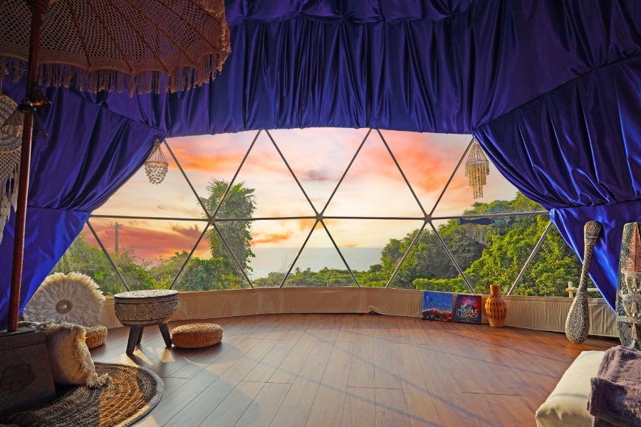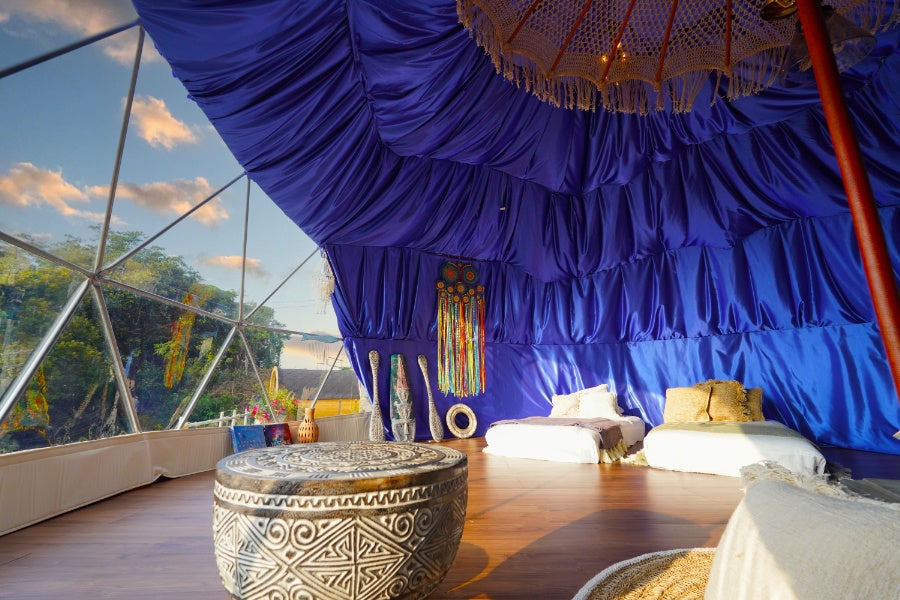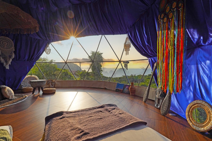 森の中の白いドームテントの広い窓に広がるのは、輝く海。海に沈む夕日が幻想的な室内は、青を基調としたギリシャのエーゲ海をコンセプトとしたデザーナーズルーム。森の中のプライベートガーデンには120本以上のハーブとブルーベリーの木を植林。爽やかな緑の香りに包また空をみあげると思わず“幸せ”を感じてしまいます。