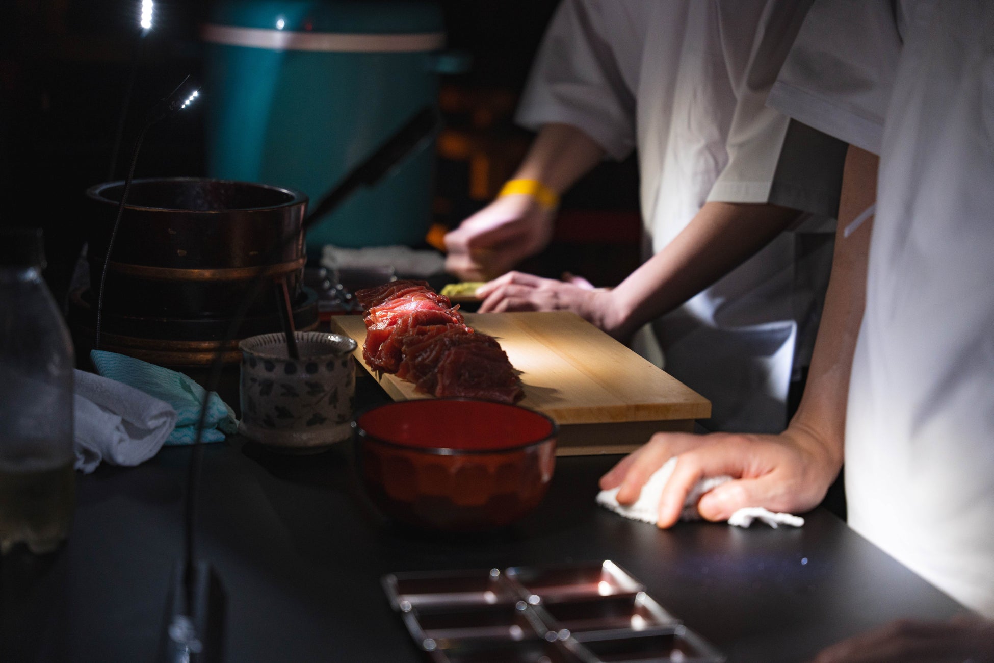 乾杯の後から、SPECIAL FOODとして鮨の振舞いが始まった。クラブミュージックが鳴り響く中、職人が登場しその場で鮨を握り提供した。