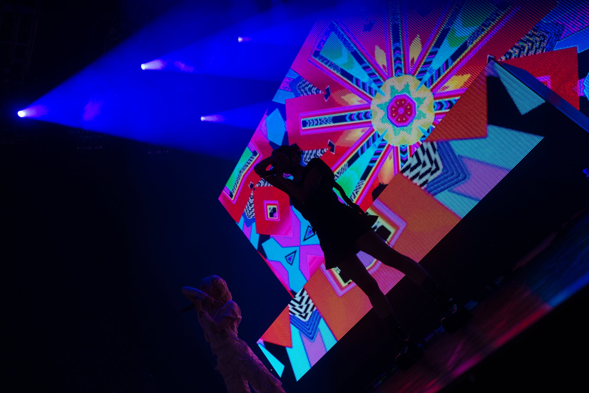 このステージのために書き下ろされた新曲「サクラガミ」のリミックスバージョンが流れ、舞台のLEDビジョンには、不敵な笑みを浮かべる妖しくも美しい小林幸子が、大画面いっぱいに映し出される。