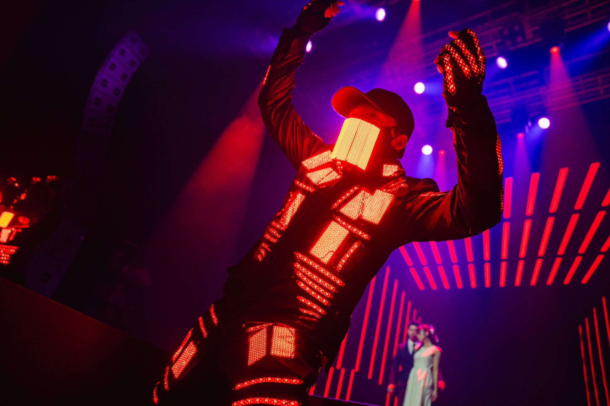 舞台前方に突如現れたのは、MPLUSPLUSのLEDを搭載した「D-Classics」のダンサーたち。悪の化身であるダンサーたちは闇を切り裂くように鮮やかに光り、赤や白に変化しながら本間と三原の行く手を阻むように舞う。暗闇の中、光を纏ったダンサーたちの動きが視覚的なインパクトを生み出し、ダイナミックな空間を創り出していく。