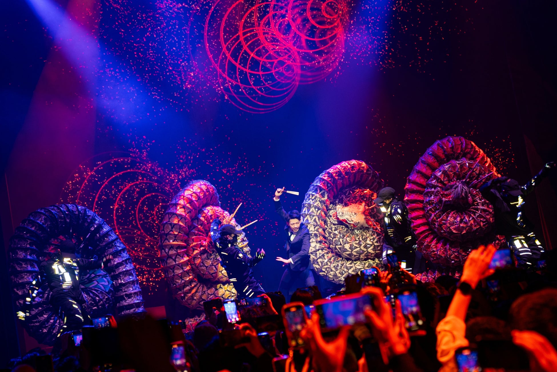 一度は敗れた三原が伝統的な衣装に早着替えし、剣を手に大蛇と再び対峙。圧倒的な力で次々と大蛇を倒していく。ポーズを決めた大蛇とともに、RYOのMPCと神楽囃子が融合し、熱いセッションに会場は歓声に包まれた。ダイナミックな動きが伝統芸能の力強さを際立たせ、初めて石見神楽を観た観客も感嘆。最後は三原のソロ演舞。テンポと音量が高まり、クライマックスへと突き進んだ。