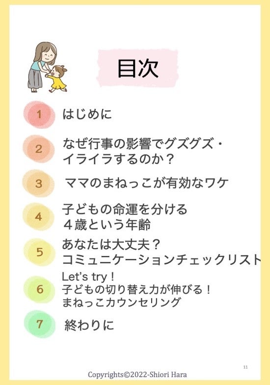 そこで私は、15年以上に及ぶ幼稚園・保育園の現場に教員・保育士として携わってきた経験と、子育ての体験から研究を重ね、「『まねっこ(逆模倣)』を親子のコミュニケーションに取り入れることで子どもが共感してもらえていることを感じ、安心感や自信を得られる!」ということを発見し、電子書籍にまとめました。今回の電子書籍では、普段の生活の中でお母さんが無理なく取り入れられる、お子さんとのコミュニケーション方法をお伝えしています