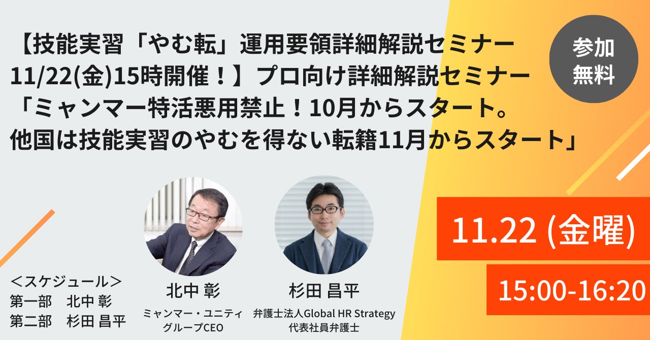 ぜ11月22日(金)に開催した【技能実習「やむを得ない転籍」など運用要領詳細解説セミナー】プロ向け詳細解説セミナー「ミャンマー特活悪用禁止!10月からスタート。他国は技能実習のやむを得ない転籍11月からスタート」をご視聴ください。