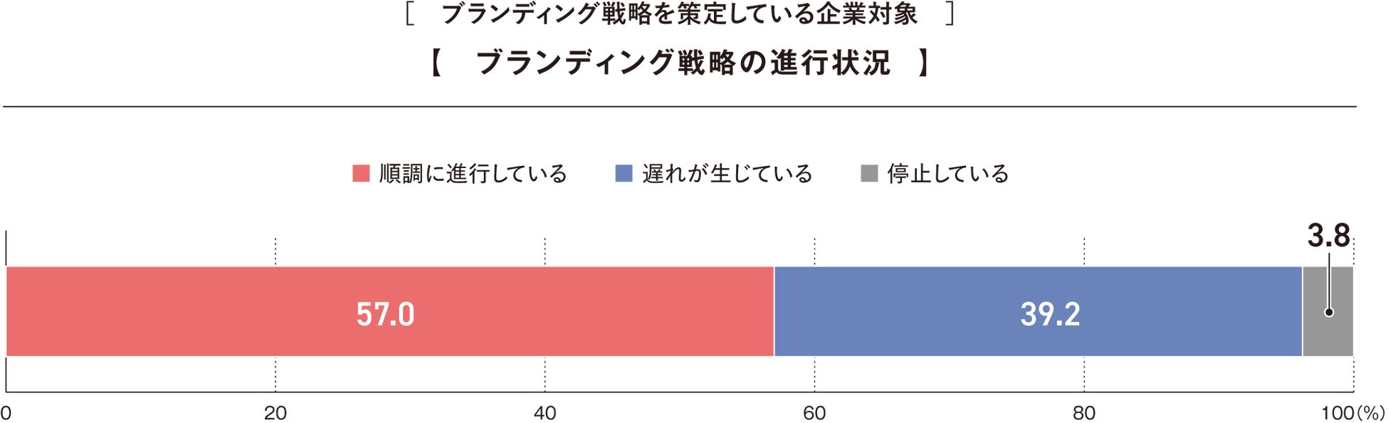 戦略を「策定している」企業に限定すると、57.0%の企業は戦略が順調に進行しているという結果となりました。一方で39.2%の企業では何らかの形で遅れが生じており、ブランディング戦略の実行に支障をきたしていることが見受けられます。さらに、3.8%の企業では戦略の進行が停止している状況です。ブランディング戦略が策定されていても、計画通り進行するためには課題が残ることが示唆されます。戦略の策定だけでなく、実行および進行管理の強化が重要です。