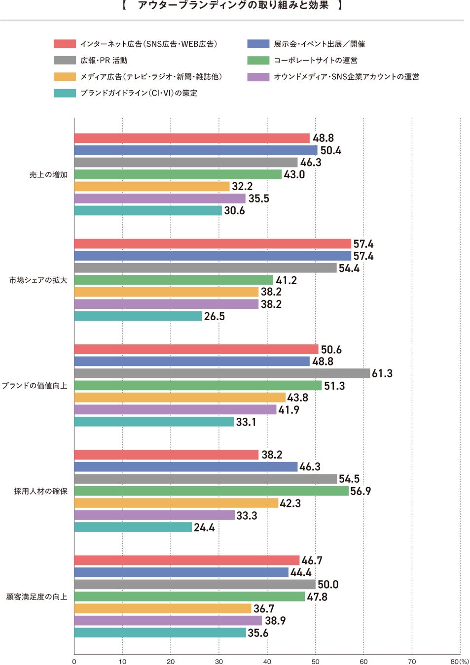アウターブランディングにおいて、取り組みによる影響と実施した施策を尋ねました。売上の増加に効果があった施策は「インターネット広告」が48.8%、「展示会・イベント出展」が50.4%となりました。市場シェア拡大においては「インターネット広告」、「展示会・イベント出展」ともに57.4%と高い割合となりました。これらは市場との接点を直接的に拡大する取り組みとして即効性があると考えられます。