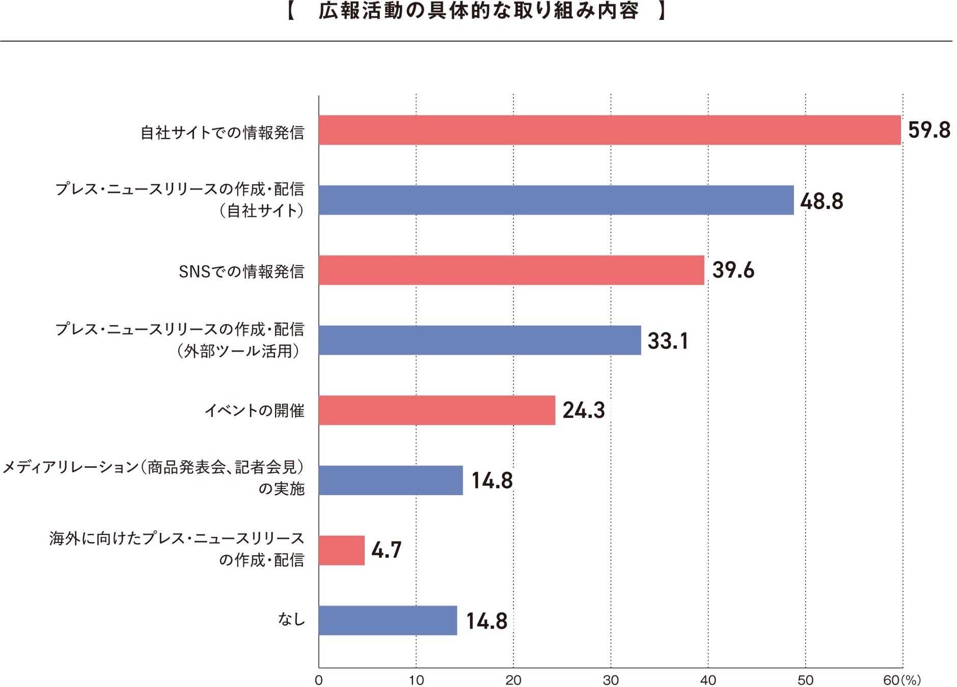 広報活動の取り組み内容について、「自社サイトでの情報発信」が59.8%と最多となり、企業の広報活動において最も主要な手段となっていることが分かりました。また、「SNSでの情報発信」も39.6%となり、デジタルコミュニケーション戦略の重要な柱となっていることが分かります。