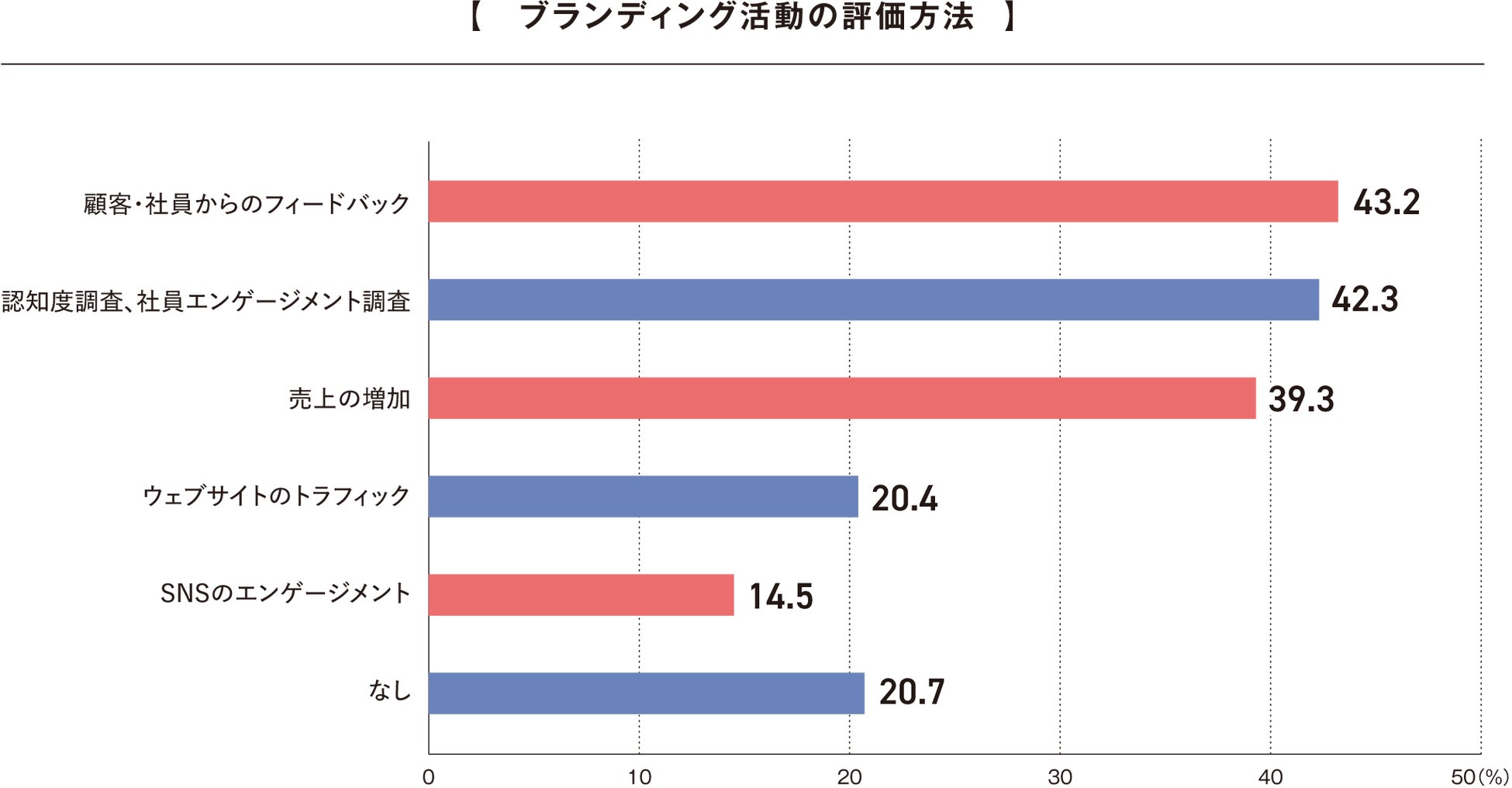 ブランディング活動の評価方法について、定性的および定量的指標のバランスが重要視されていることが明らかとなりました。特に、顧客や社員からのフィードバック(43.2%)や認知度調査、社員エンゲージメント調査(42.3%)が上位を占めており、顧客や社員の声を重視する傾向が顕著です。また、売上の増加(39.3%)もブランディング活動の主要な評価指標となっており、ブランディング活動の最終的な成果を経済的観点から測定していること分かります。一方で、デジタル指標であるウェブサイトのトラフィック(20.4%)とSNSのエンゲージメント(14.5%)の割合は相対的に低く、デジタルマーケティングの影響力は活動の評価指標としては限定的であることが示唆されます。