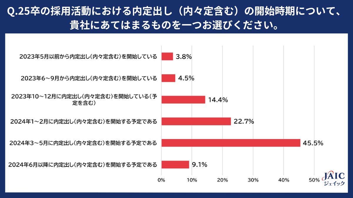 「内定出し(内々定含む)の開始時期」は、「2023年5月以前」が3.8%、「2023年6~9月」が4.5%、「2023年10~12月」が14.4%、「2024年1~2月」が22.7%、「2024年3~5月」が45.5%、「2024年6月以降」が9.1%となり、25卒の採用広報の解禁となる2024年3月より前に内定出しを開始する(予定である)と回答した企業は合わせて45.5%となりました。