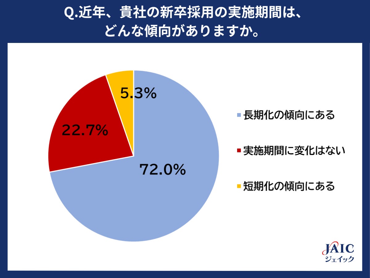「近年、貴社の新卒採用の実施期間は、どのような傾向がありますか」と質問したところ、「長期化の傾向にある」が72.0%、「実施期間に変化はない」が22.7%、「短期化の傾向にある」が5.3%となりました。
