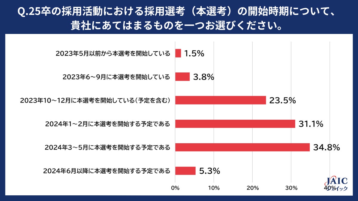 が3.8%、「2023年10~12月」が23.5%、「2024年1~2月」が31.1%、「2024年3~5月」34.8%、「2024年6月以降」が5.3%となりました。就活広報の解禁となる2024年3月以前に「採用選考(本選考)を開始する(予定である)」と回答した企業は合わせて59.8%となりました。