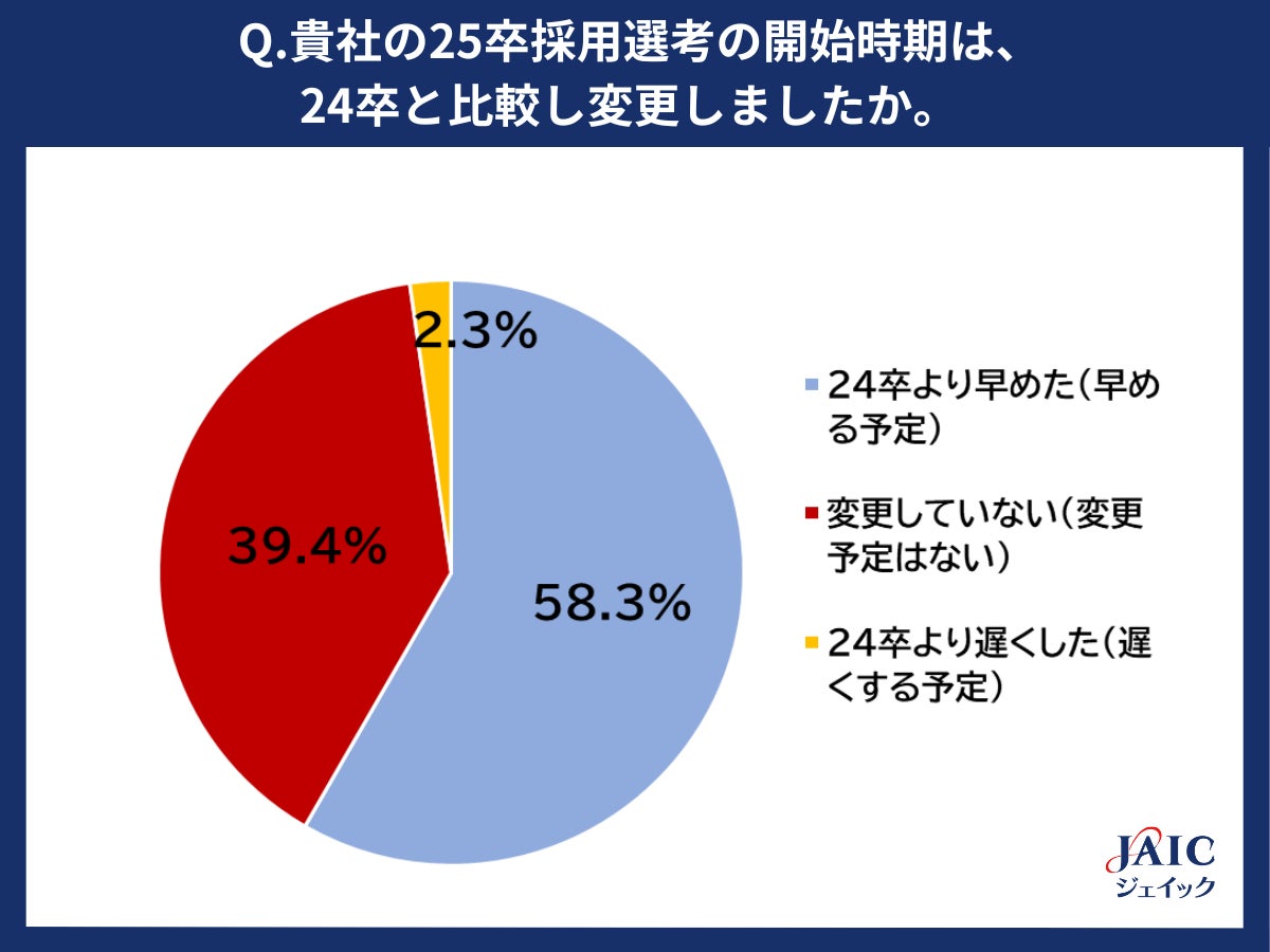 「24卒と比較した25卒採用選考の開始時期」について質問したところ、「24卒より早めた(早める予定)」が58.3%、「変更していない(変更予定はない)」が39.4%、「24卒より遅くした(遅くする予定)」が2.3%となりました。