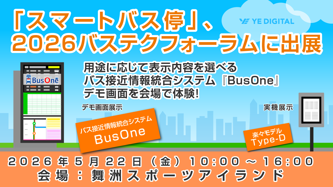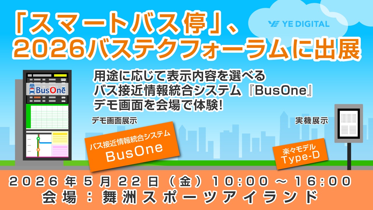 株式会社YE DIGITAL(本社:北九州市小倉北区、代表取締役社長:玉井裕治、以下YEデジタル)が提供する「スマートバス停」を、2026年5月22日(金)に舞洲スポーツアイランド(大阪府大阪市)で開催される『2026バステクフォーラム』に出展します。