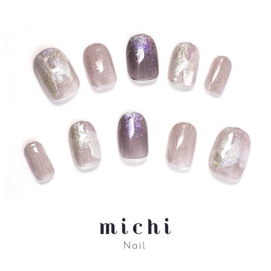 スモーキーなパープルと淡いピンクのベースにキラキラのパウダーが輝くこちらのネイル。主張しすぎないニュアンスアートが魅力的な指先を演出します。デートにぴったりの大人かわいいネイルです。