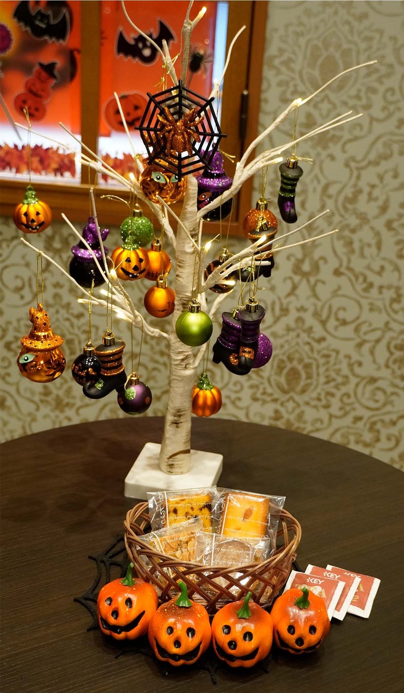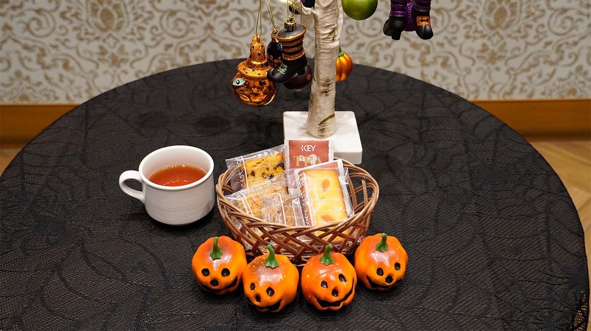 「ハロウィンルーム」ご利用の宿泊プラン「かぼちゃたちと一緒にハロウィンパーティーナイト」は、焼き菓子と紅茶のセット付き。かぼちゃがモチーフのジャック・オー・ランタンをはじめ〝コワかわいい〟アイテムで装飾されたフォトジェニックな客室で、秋の夜長をお楽しみください。