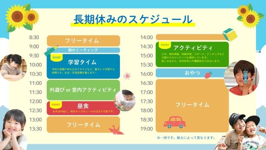 こうした背景を受け、明光キッズでは、毎年多くのご家庭にご好評をいただいている「夏のお試しプラン 2025」を、今年もご用意しました。子どもたちが楽しく安全に過ごせる環境と、保護者の皆さまに安心していただけるサポート体制で、夏休みをしっかり支えます。
