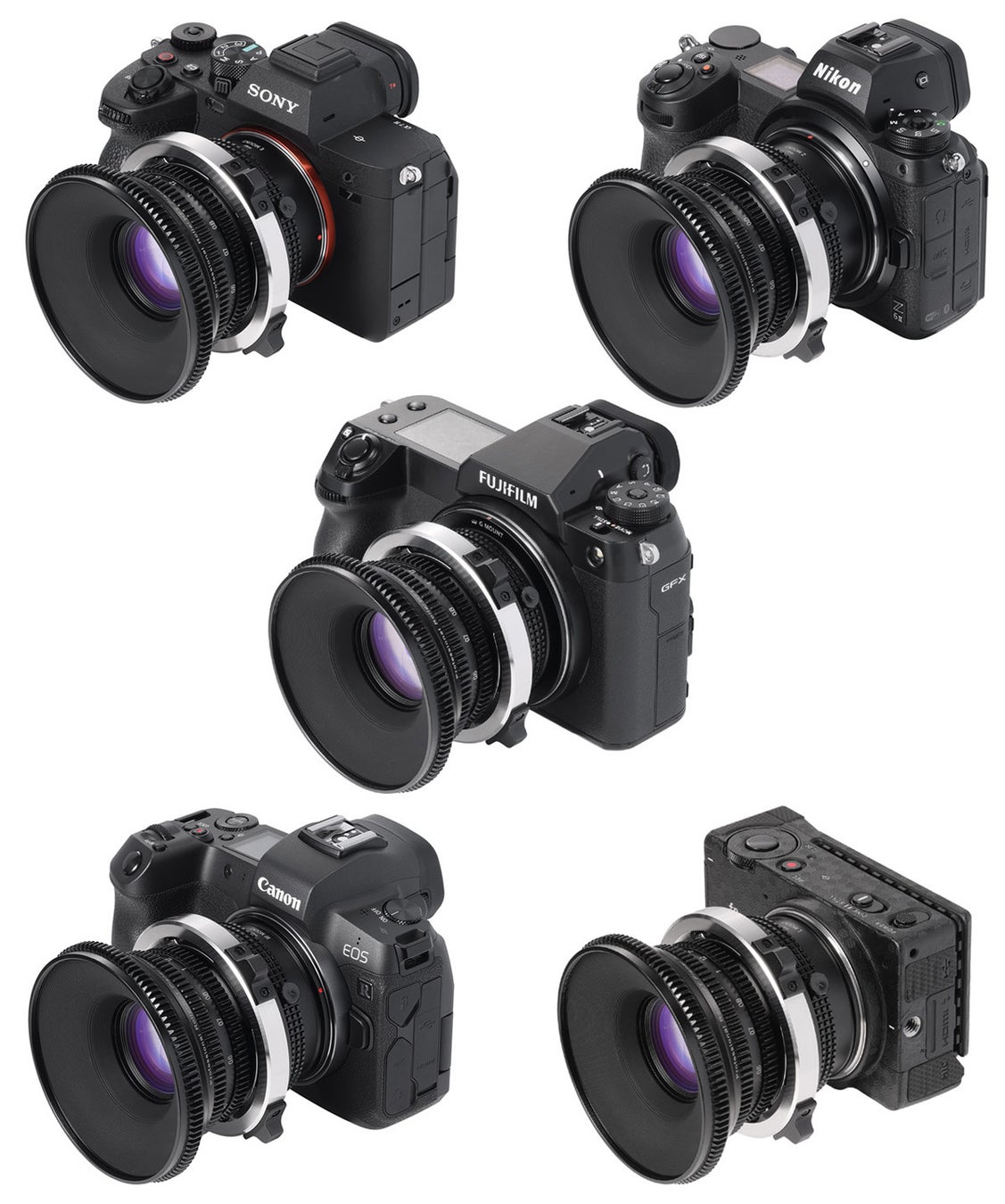 対応マウントは、レンズ側が「PLマウント」、カメラ側が「ソニーE」「富士フイルムG」「ニコンZ」「キヤノンRF」「L」マウントの5種。