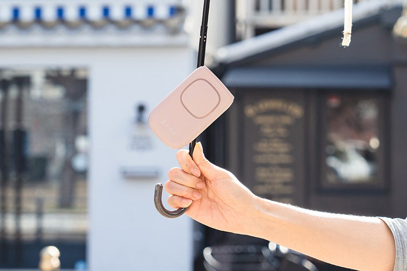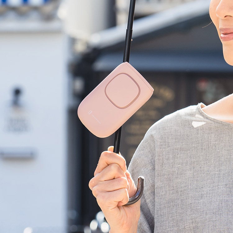夏の外出時に嬉しい、日傘に装着できるファン。ストラップをつけるとハンズフリーに、卓上置きなどにも対応する汎用性の高さが魅力。