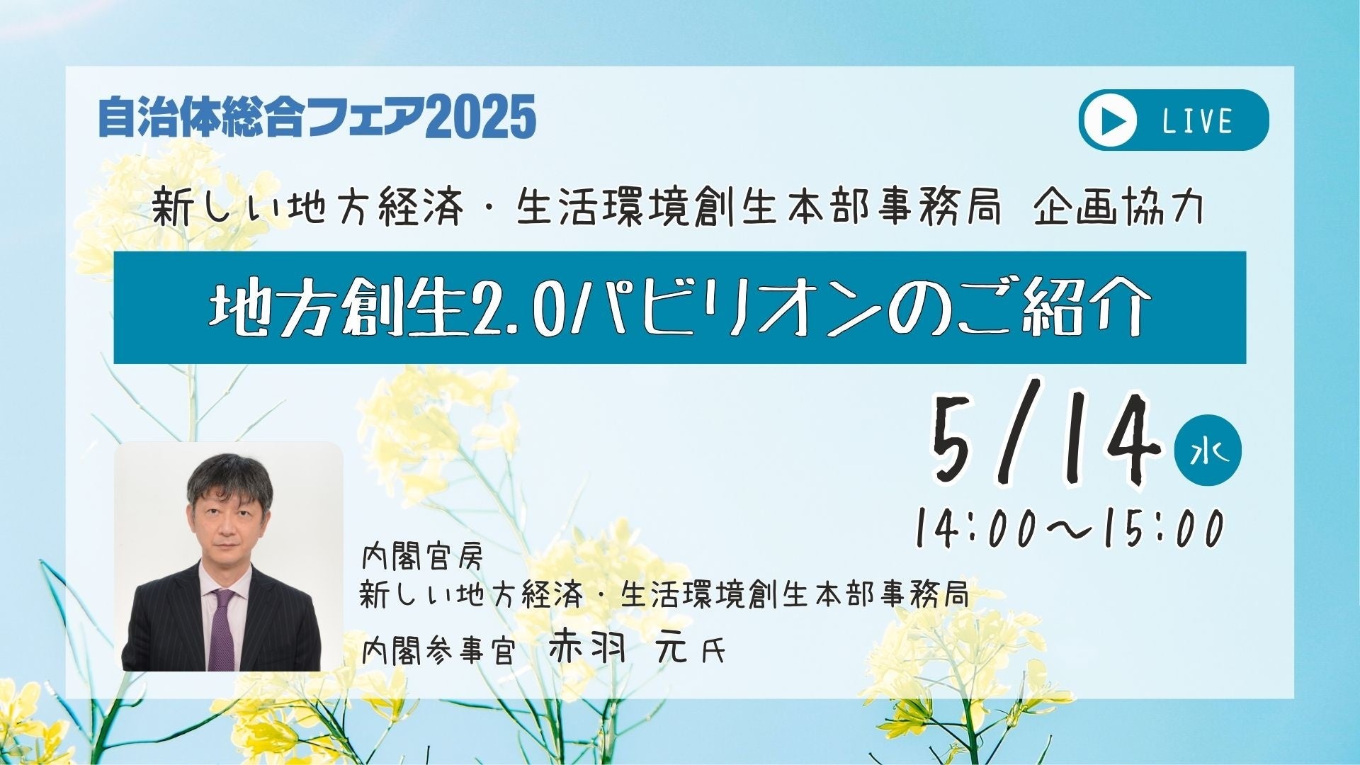一般社団法人日本経営協会(本部事務局:東京都渋谷区、会長:高原 豪久)は、「自治体総合フェア2025」開催にさきがけ、内閣官房 新しい地方経済・生活環境創生本部事務局ご担当者をお招きし、無料オンラインセミナー「地方創生2.0を知ろう!盛り上げよう!【地方創生2.0パビリオン】のご紹介 」を5月14日(水)14~15時に開催いたします。