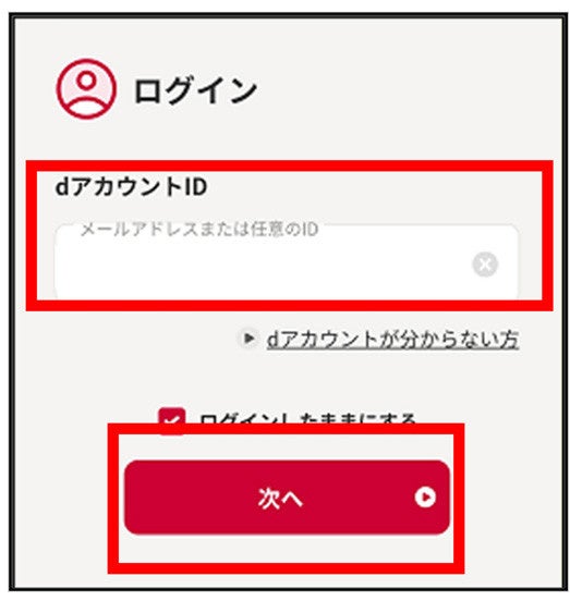 3.「dアカウントID」を入力して、「次へ」をタップ