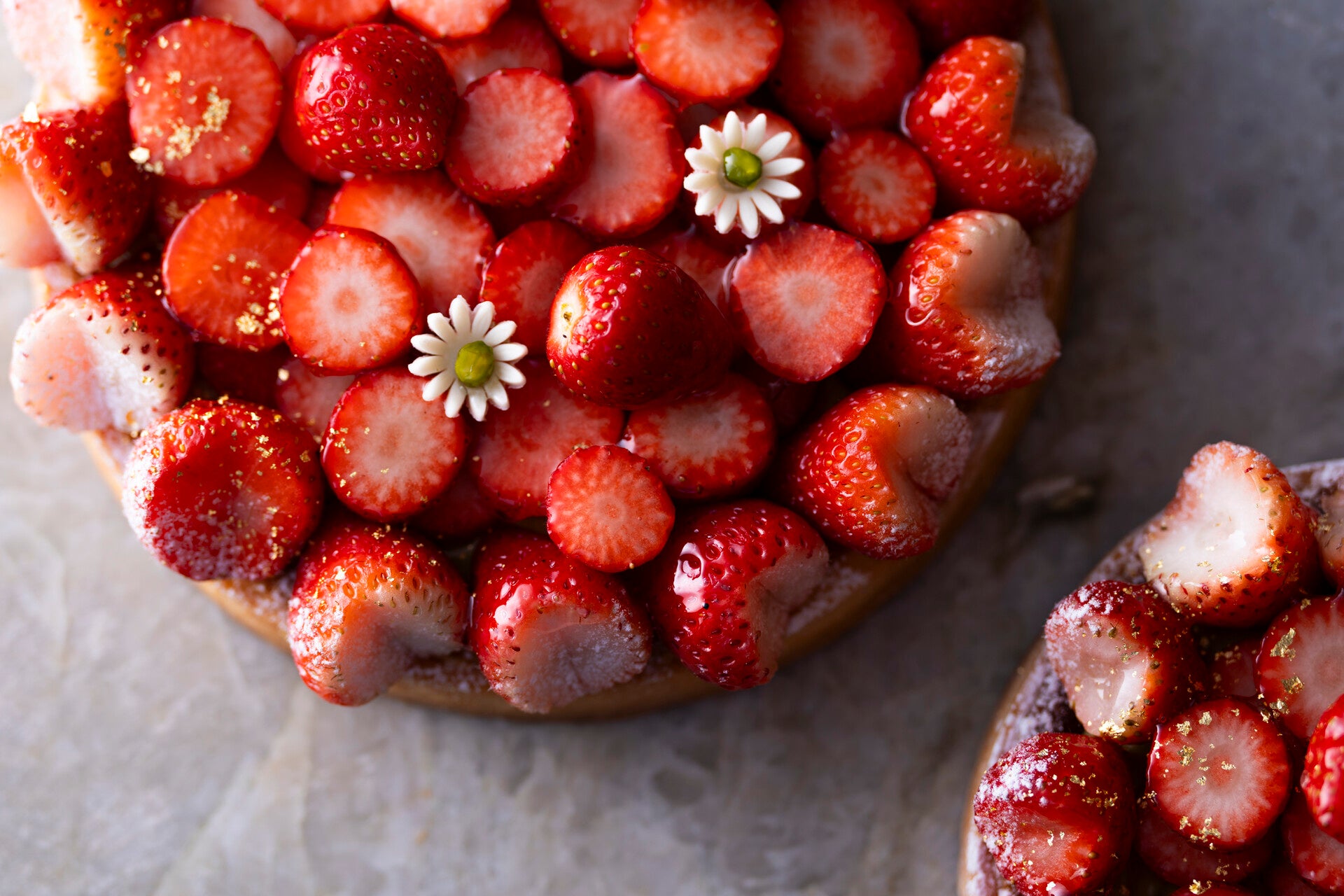 この冬のスイーツには、今一番おいしい季節を迎えたイチゴを贅沢に使ったストロベリータルトが登場です。ピスタチオアーモンドクリームを練り込んだタルトの上に、甘酸っぱいイチゴのコンフィチュールと香り豊かなピスタチオクリームを重ね、仕上げにフレッシュのイチゴをたっぷり使ってデコレーションしました。