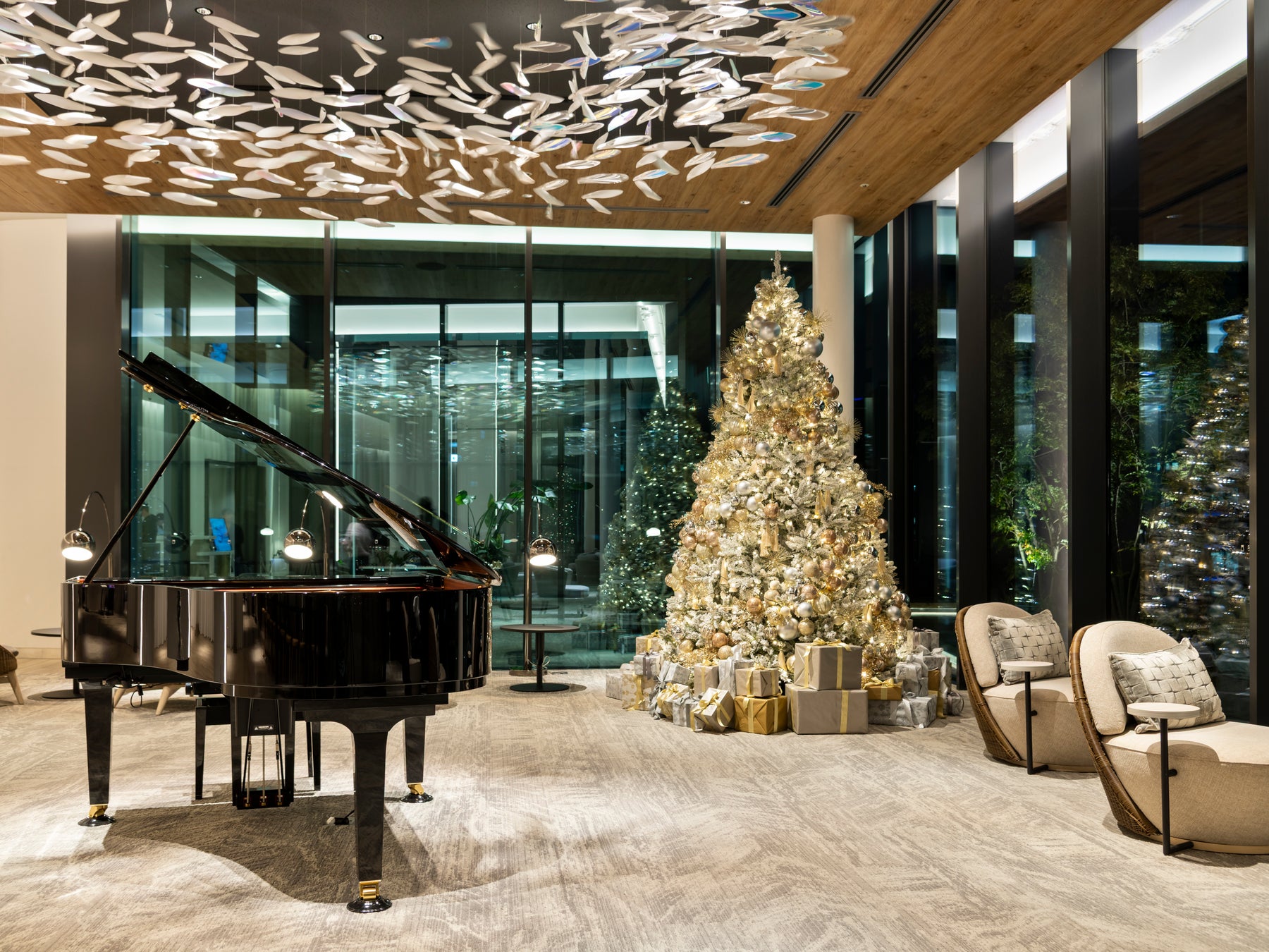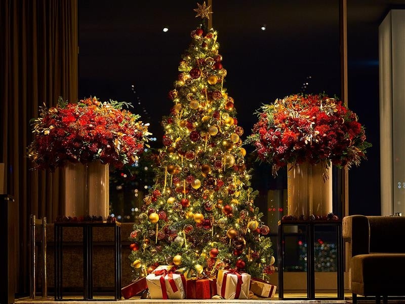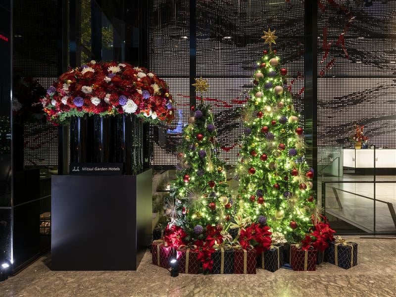 三井ガーデンホテルズ国内外35施設のロビーにて、クリスマスツリーや季節装飾を実施しています。銀座プレミア、六本木プレミア、京都三条プレミアなどでは、生花を用いた華やかなフラワーデコレーションがお客様をお迎えします。三井不動産グループ第一園芸株式会社トップデザイナー・新井光史氏による装飾が、特別な滞在を彩ります。