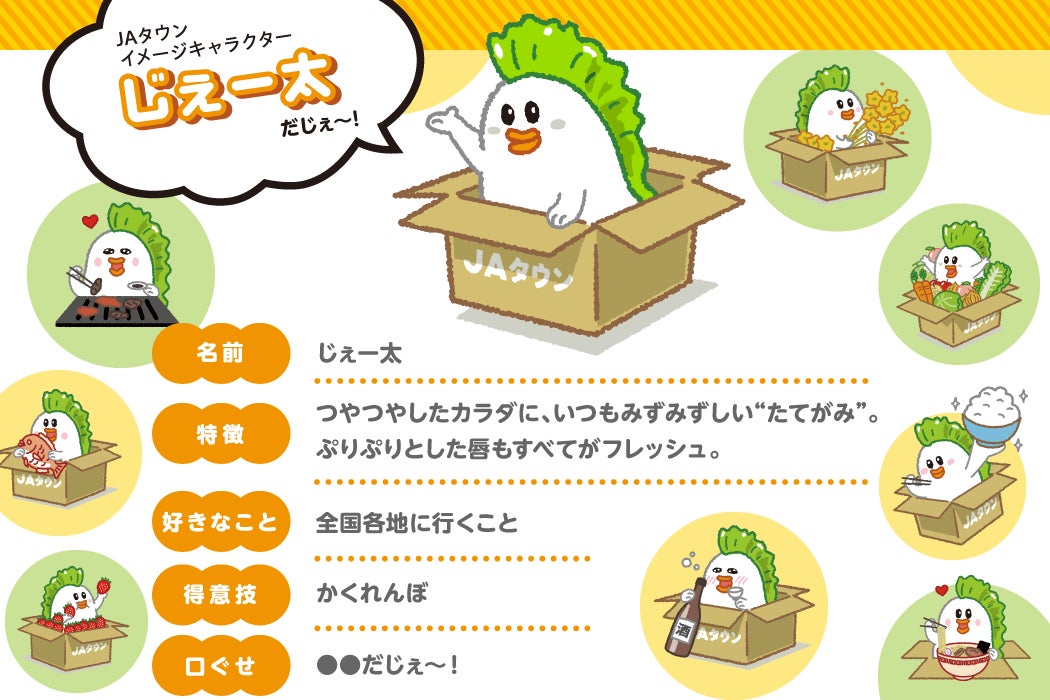 JA全農は、産地直送通販サイト「JAタウン」に出店する「じぇー太の寄ってけよろずや」で、JAタウンイメージキャラクター「じぇー太」グッズを販売中です。