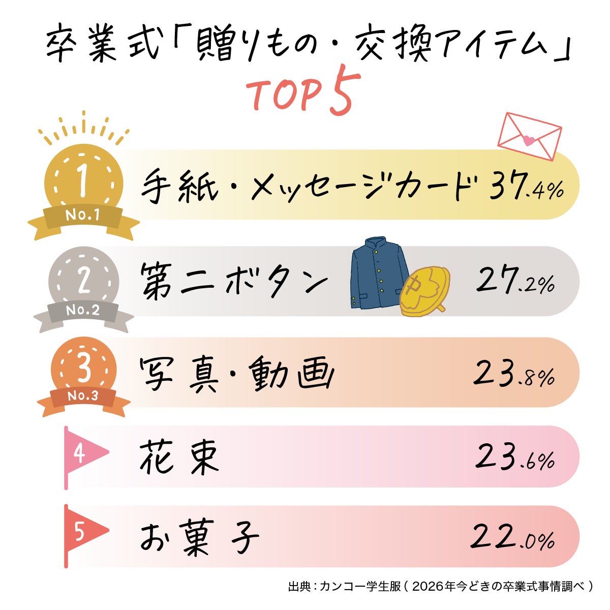 最も多かった贈りものは「手紙・メッセージカード(37.4%)」で、SNS全盛期であっても手書きの温もりが重視されています。続く第2位には「第二ボタン(27.2%)」がランクインし、令和における定番であることが証明されました。また、6位以下では「リボン・ネクタイ」や「校章」などがランクインし、近年は制服小物を贈り合う新しいスタイルも広がっています。