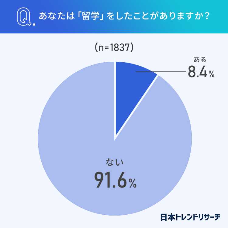 全国の男女1837人のうち、8.4%が留学をしたことが「ある」と回答しました。