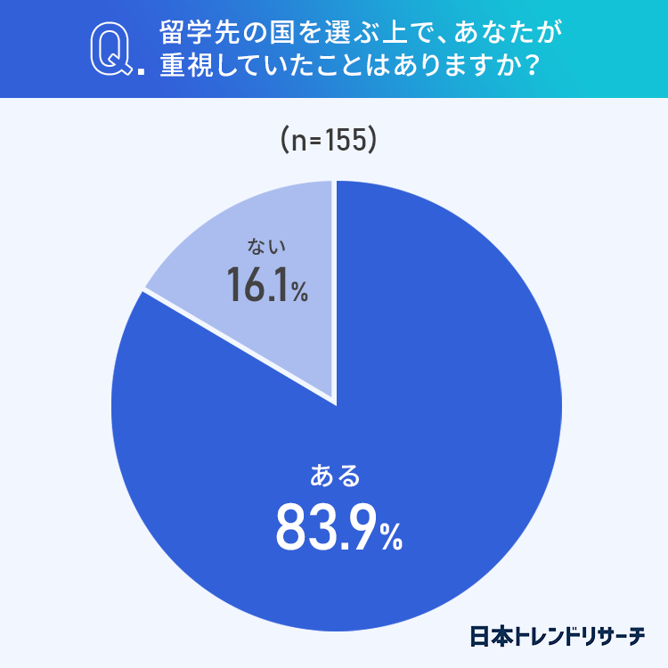 83.9%の方が、留学先を決めるときに重視していたことが「ある」と回答しました。