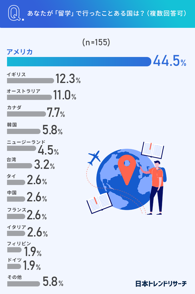 「アメリカ」が44.5%ともっとも多く、次いで「イギリス」「オーストラリア」が多い結果になりました。