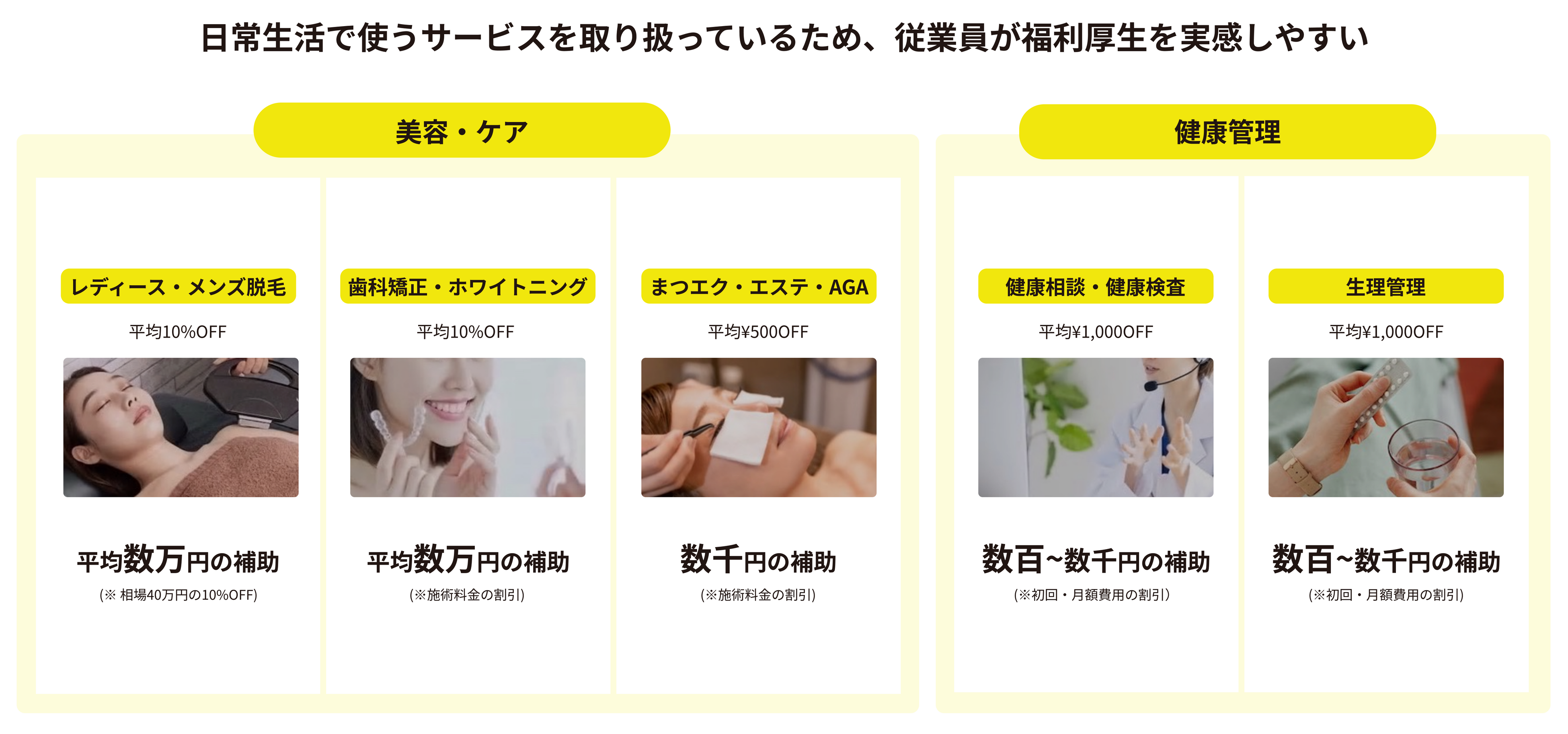 「ジンジャー福利厚生」では、日常生活で利用する店舗(カフェ、コンビニ、定食屋、美容、健康管理に関するサービスなど)の利用料金を、福利厚生として安価で従業員へ提供することができます。これにより「ジンジャー福利厚生」を導入している企業の従業員は、日常生活で利用するサービスの料金を通常料金よりお得に受けることができるようになります。