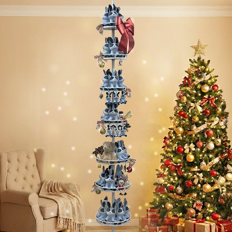 クリスマスの飾りも差し込みながら完成したのは、360度どこから眺めてもうさぎと目が合う、幸福度120%の『推しぬいツリー』!これだけの数があっても全員埋もれず前を向けて並べられるのは、円盤型の棚板を採用している「ぬいタワー」ならでは。キーチェーンタイプはバーに吊り下げて飾ることができ、オーナメントとあわせてレイアウトを考える工程そのものも楽しめました。