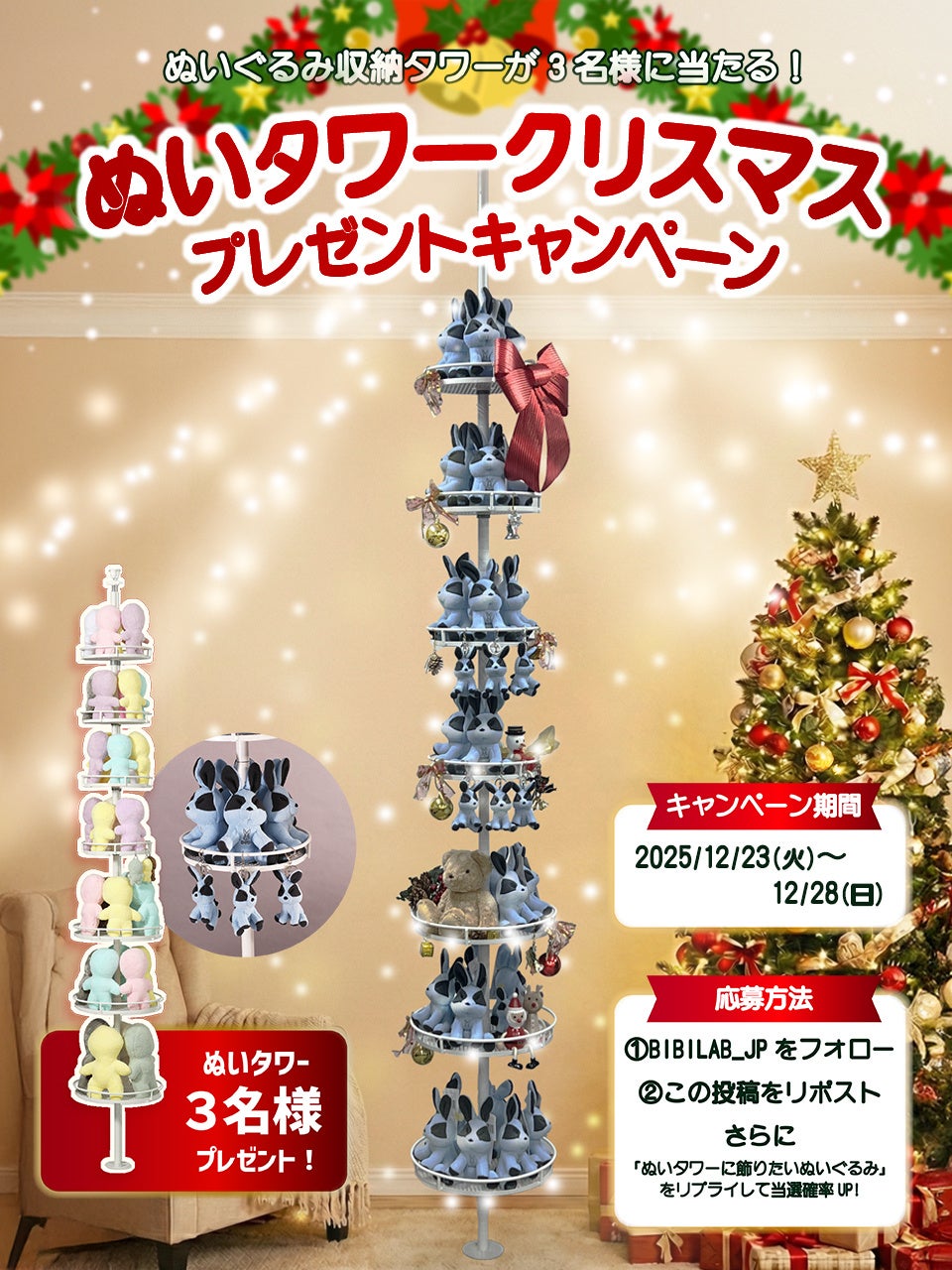 弊社趣味グッズブランド「BIBILAB®(ビビラボ)」は、本日2025年12月23日(火)~同月28日(日)の6日間にわたり、ぬいぐるみ収納「ぬいタワー LBR-350」が抽選で当たるSNSキャンペーンを開催することをお知らせいたします。同社アウトドアブランド「DOD(ディーオーディー)」との特別コラボカットも公開し、クリスマスの推し活・ぬい活を盛り上げます。