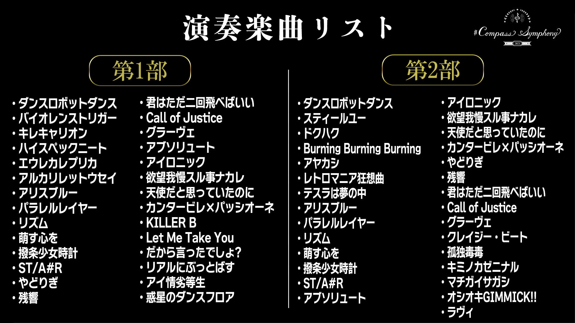 『#コンパス』は、これまでDJショーやバンドライブ、オーケストラなど、様々なジャンルの音楽イベントで、ゲーム内に実装されている人気楽曲を披露し、ファンを魅了してきました。『#コンパス』史上初の単独フルオーケストライベントとなる本公演は2部構成となり、『ラヴィ』『アルカリレットウセイ』『ダンスロボットダンス』など、人気ボカロPが手掛けるオリジナル楽曲計57曲を東京交響楽団が大迫力の生演奏でお届けします。